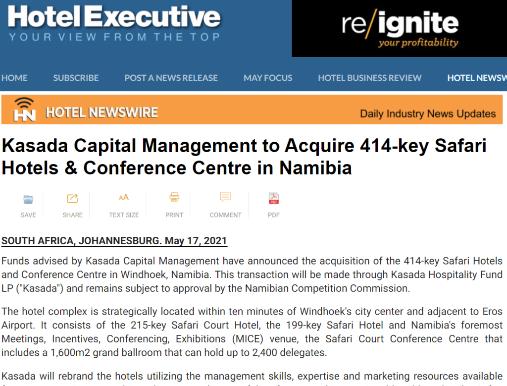 “This transaction is aligned with Kasada’s strategy of bringing our capital and expertise to the management of existing properties in key locations in Sub-Saharan Africa. We look forward to bringing our international hospitality know-how to Namibia’s leading hotel complexes, heralding a new chapter in its storied history with the incorporation of ESG and international best practices, and the creation of 150 jobs.”