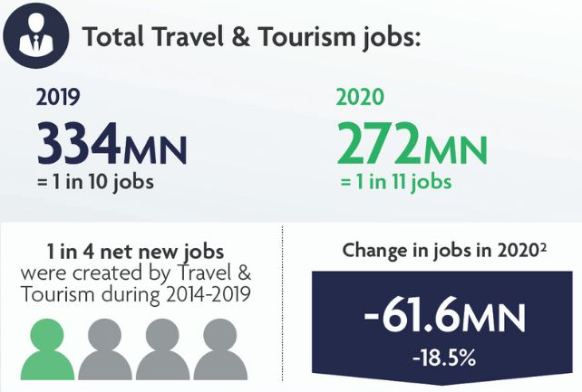 330 Million jobs (1 in 10 jobs) around the world (providing critical jobs to youth & women) & 27 million Europeans worked in the travel & tourism sector (2019).
